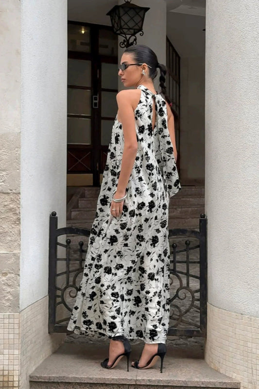 Black & White Print Halter Side-Slit Midi Dress