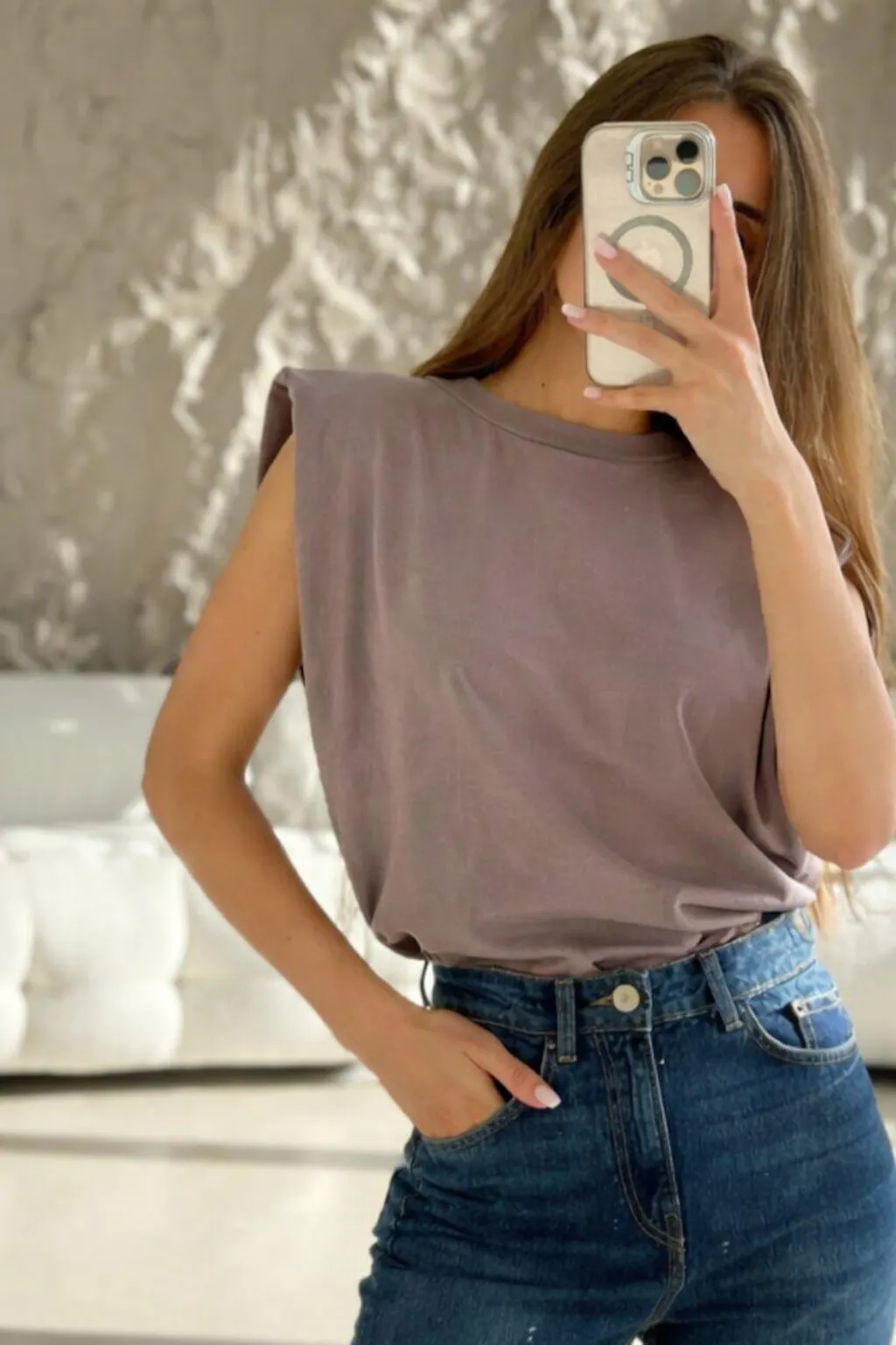 This sleeveless shoulder-pad T-shirt settles naturally into the contemporary wardrobe.